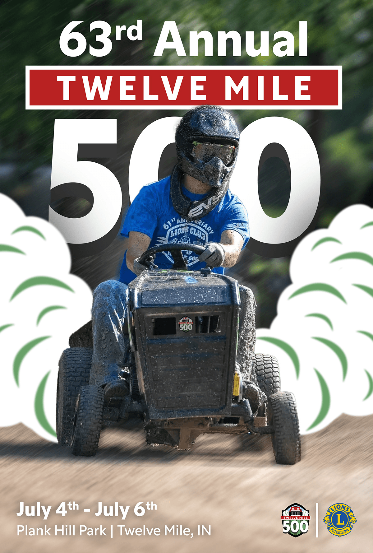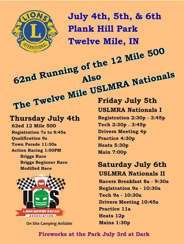 The Twelve Mile 500 is 15 mile lawnmower race that has been running annually since 1963, making it “America’s Oldest Lawn Mower Race”. The race is held every July 4th at Plank Hill Park in Twelve Mile, Indiana.